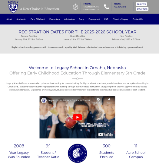 Legacy School is private, nonsectarian preschool and elementary school in the Omaha area. The website is critical tool to share information with potential parents and illustrate what makes them unique. After several month of collecting data, the website was overhauled to address main areas of concern without sacrificing the strong gains made through previous SEO efforts.